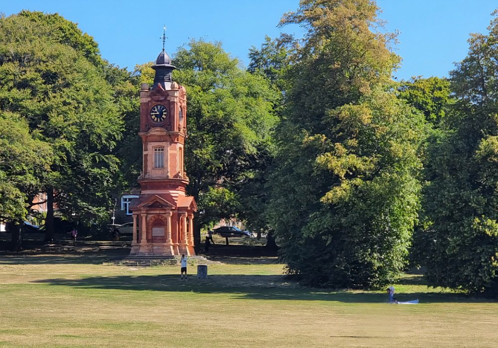 The red-brick and terracotta tower dates from 1892. It is a focal point of the park, decorated with flower motifs, columns, and a dolphin-shaped weather vane.